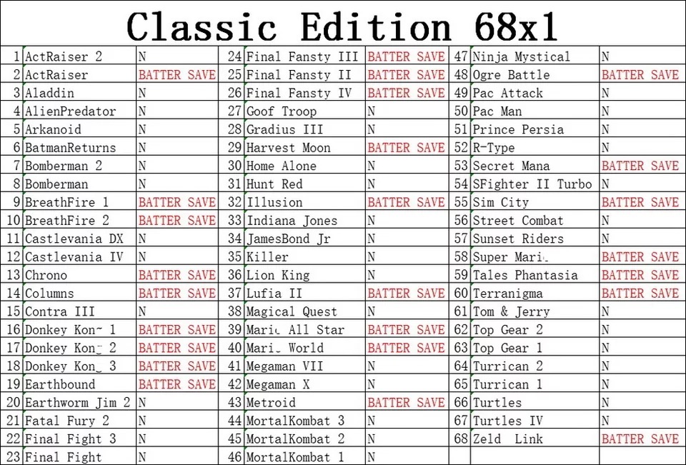 16 Bit Game Card - Super 68 in 1 Classic Collection SNES Multicart Super NES Games Cartridge for Retro SNES Game Console | English Language NTSC US Version